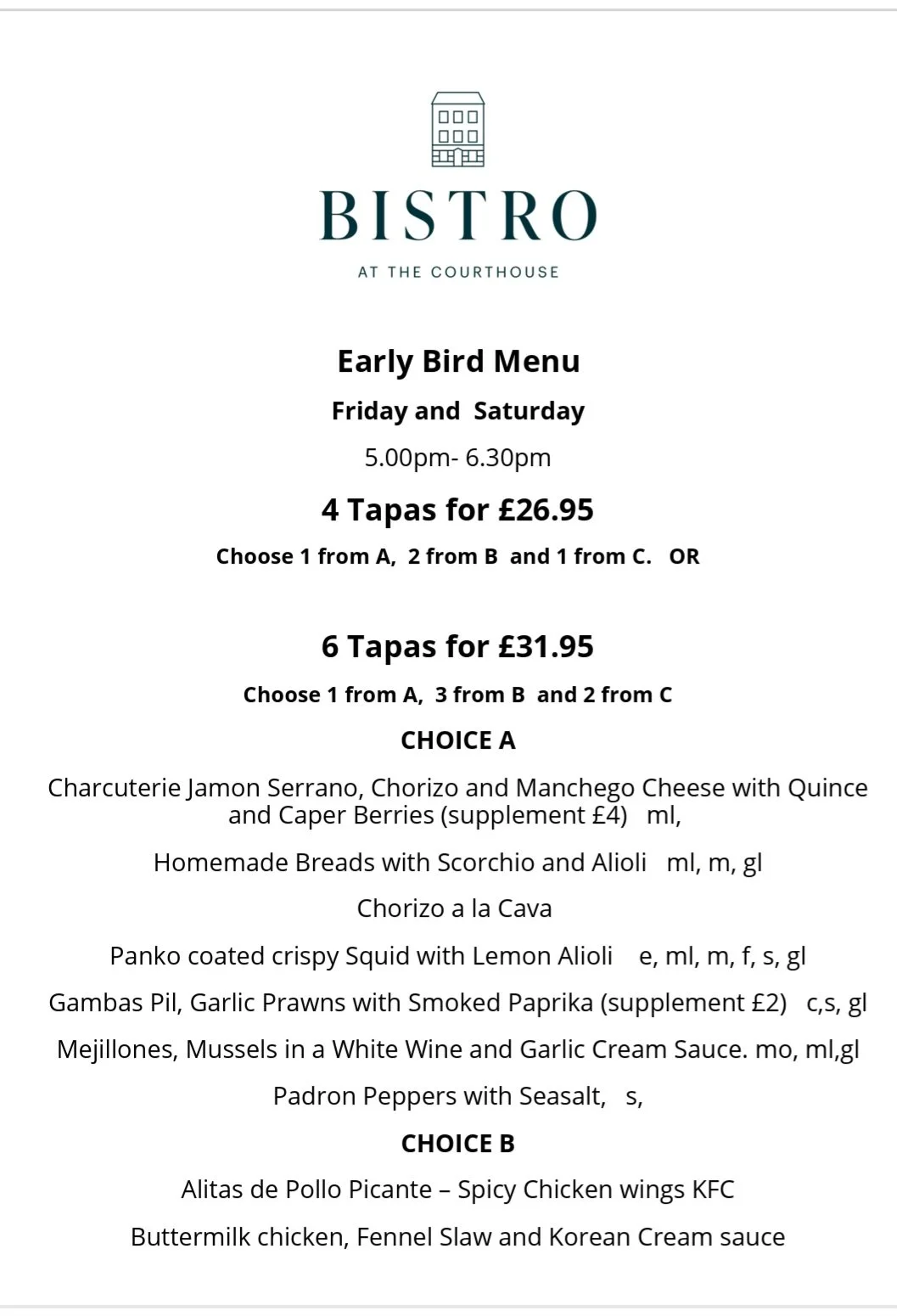 Menu served Friday and Saturday 5pm to 6,30pm